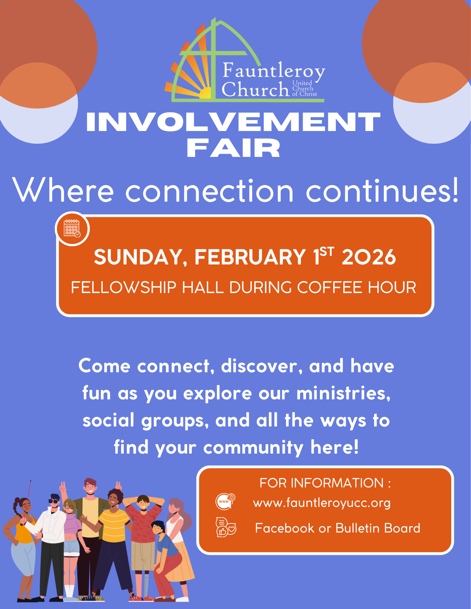 Look for more event details in the weekly newsletter, Sunday worship bulletins, on Facebook, and on the church website. Questions? Contact the church office: 206-932-5600 or info@fauntleryoucc.org.